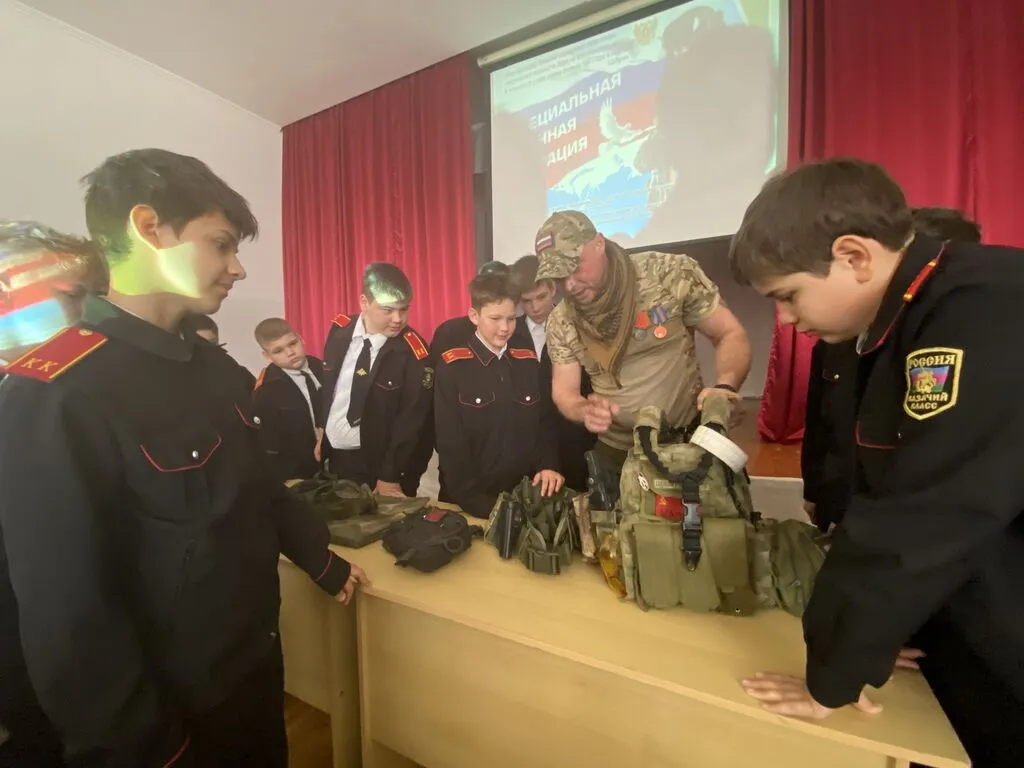 Гостем мероприятия стал ветеран СВО, капитан Шамуков Артем Радионович. Артем Шамуков рассказал, о том, как он стал военным, о буднях участников боевых действий, о сложных ситуациях, возникающих на передовых позициях и в тылу, он показал школьникам видео фрагментов жизни в полевых условиях.